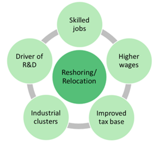 Der er en fuldkommen klar sammenhæng mellem et samfunds generelle lønniveau, velstand og forbrugsevne, så hovedparten af verdens produktion forbruges i højindkomstlandene. Med en effektiv robottisering får lønandelen en minimal indflydelse på stykomkostningerne, så produktionen flyttes derfor tilbage til højindkomstlandene for at komme tættere på markedet med deraf følgende hurtigere levering, lavere transportomkostninger og en mere miljøvenlig produktion.