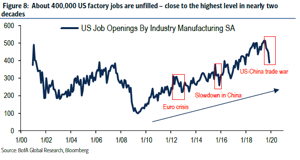 Der er omkring 400.000 ubesatte fremstillings jobs i USA, og man konkluderer, at det skyldes arbejdsstyrkens generelt manglende uddannelsesniveau. Illustration: Bank of America
