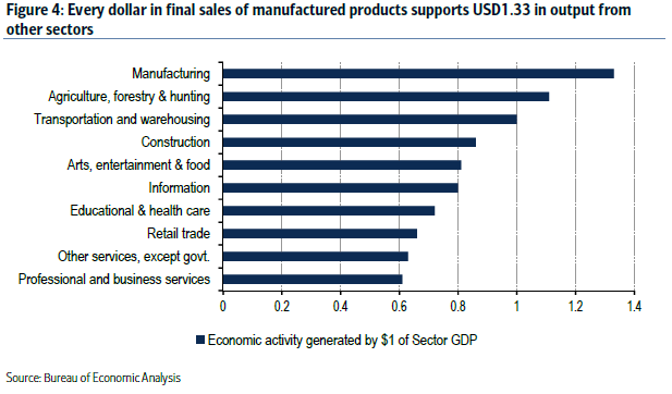 Fremstillingsvirksomheder skaber ”ringe i vandet” og genererer beskæftigelse i andre sektorer. Statistikken viser, at hver eneste krone/$ investeret i reel fremstilling skaber dobbelt så meget aktivitet som hvis det samme beløb investeres i detailhandel.