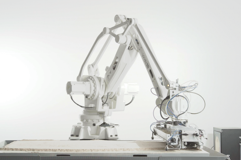 En robot med et 3D printerhoved, som omdanner savsmuld til nye træprodukter. Ill: Forust