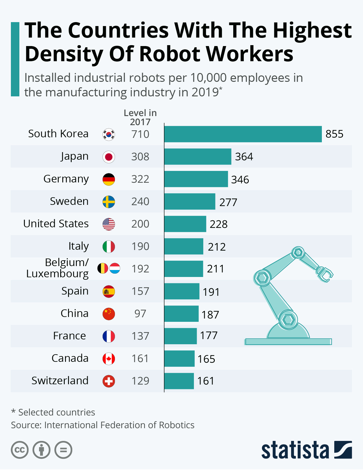 Kina ligger langt nede på listen, men som det fremgår af tabellen har Kina indenfor de sidste år haft en voldsom vækst i brugen af robotter, og denne kraftige vækst kommer til at fortsætte. Men med Kina’s enorme produktionsapparat vil det tage nogle år, før man kommer op blandt de førende lande.