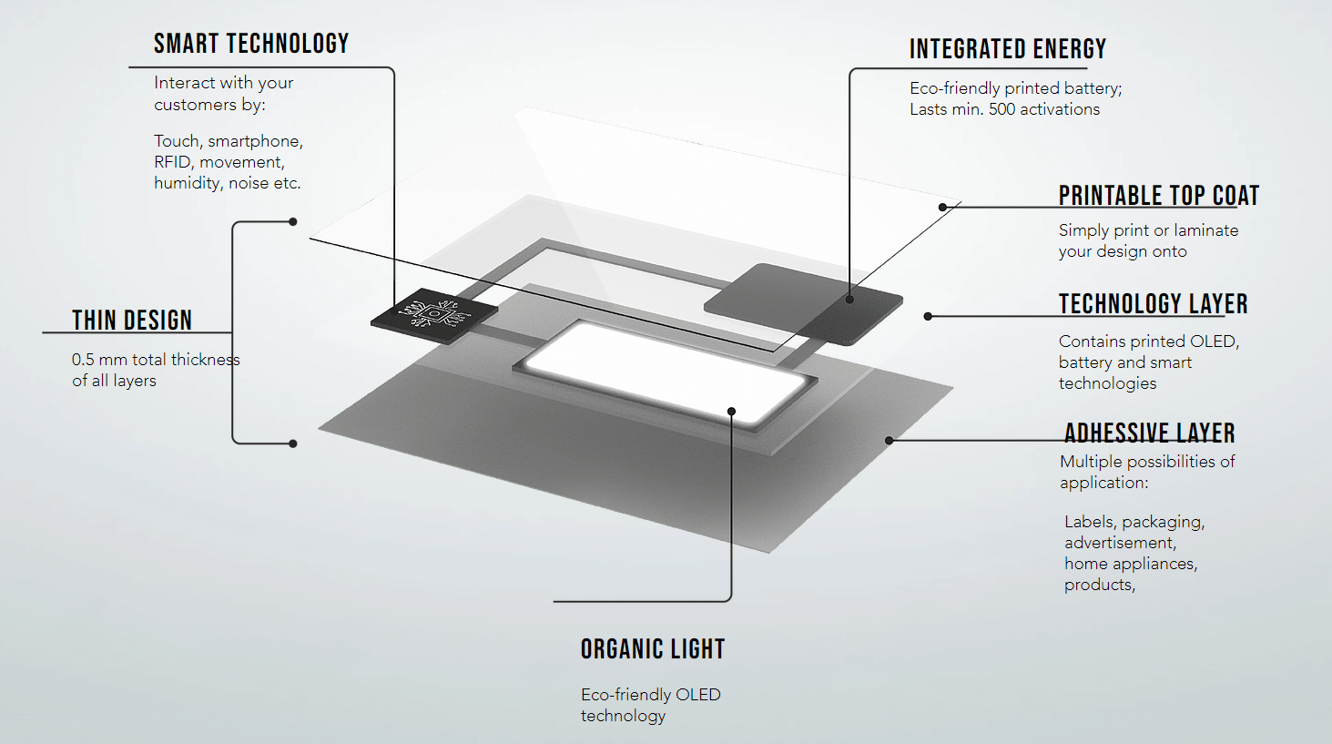 Materialet er baseret på to lag og mellem lagene findes en OLED (organisk LED) skærm, noget elektronik og et batteri samt en sensor, som kan starte og stoppe hvad der vises på OLED skærmen. Sensoren kan aktiveres på forskellige måder, f.eks. ved at en berøring eller en bevægelse foran sensoren, ændring i lydniveau eller en timer.