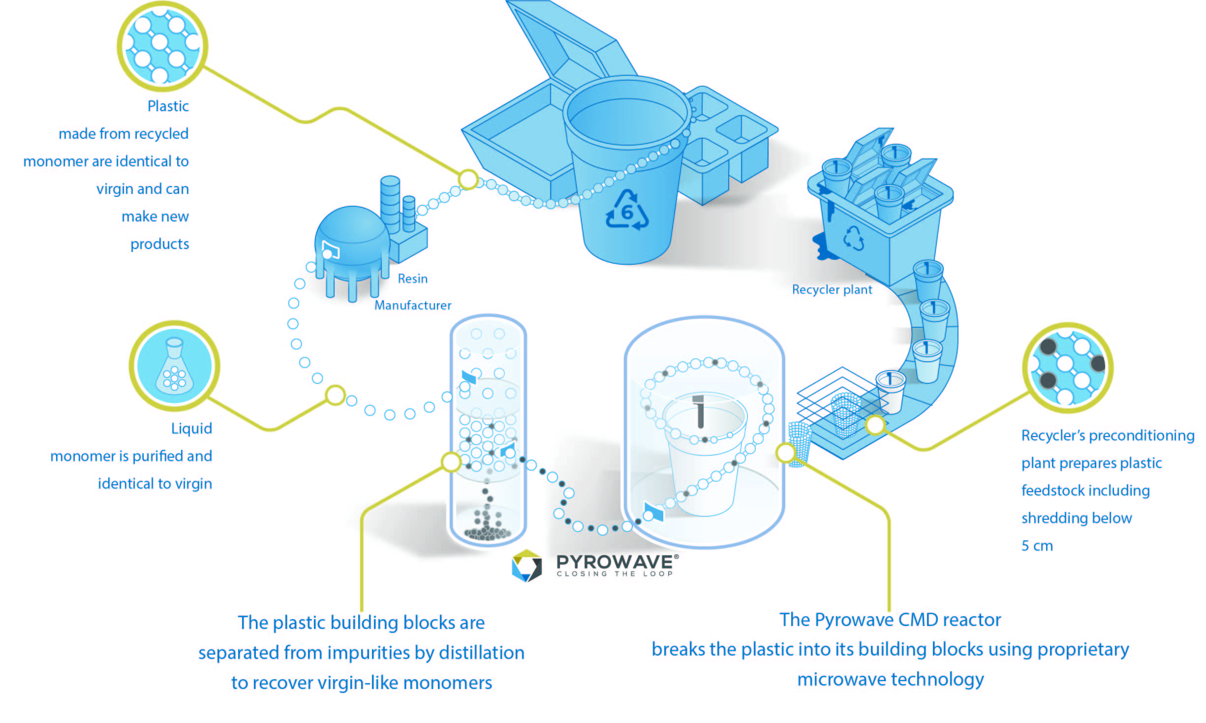 Den kemiske recycling proces kræver vældig høje temperaturer for at nedbryde de polymere til monomere materialer. Pyrowave anvender mikrobølger baseret på elektrisk energi til at skabe disse vældig høje temperaturerer, som resulterer i rene monomere materialer med en renhedsgrad på 99,8% i forhold til helt nye materialer. De høje temperaturer sikrer også at alle uorganiske og organiske forurenende emner fjernes effektivt, ligesom stål (der er stål i radialdæk) og plastic skilles effektiv ad.