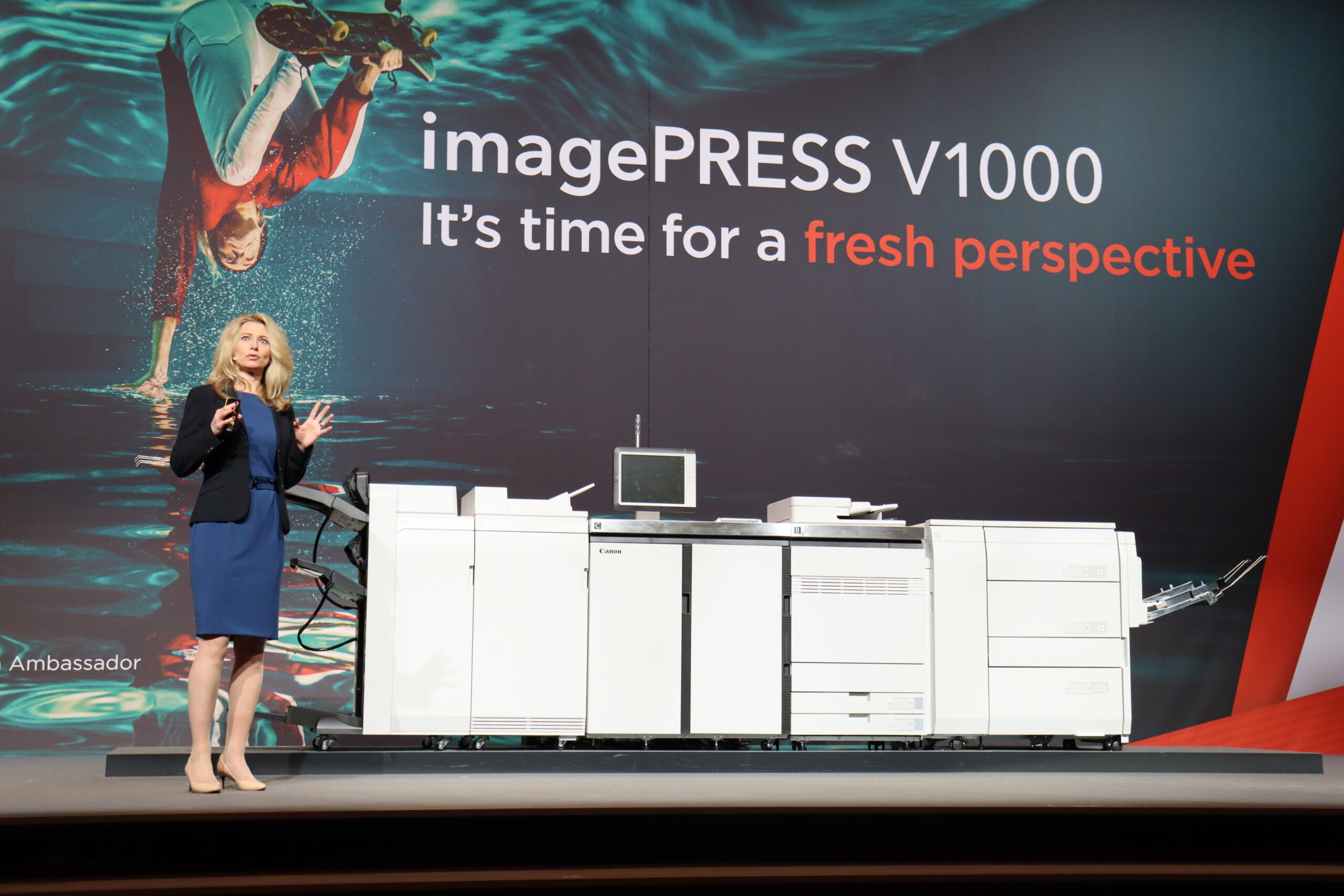 Canons Jennifer Kolloczek, Senior Marketing and Innovation Manager i Europa, holdt hovedtalen før maskinens premiere. Foto af Claes Nordström
