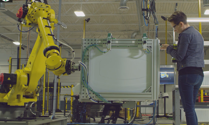 Med FreeMove softwaren kan en operatør arbejde tæt sammen med store industrirobotter uden sikkerhedshegn